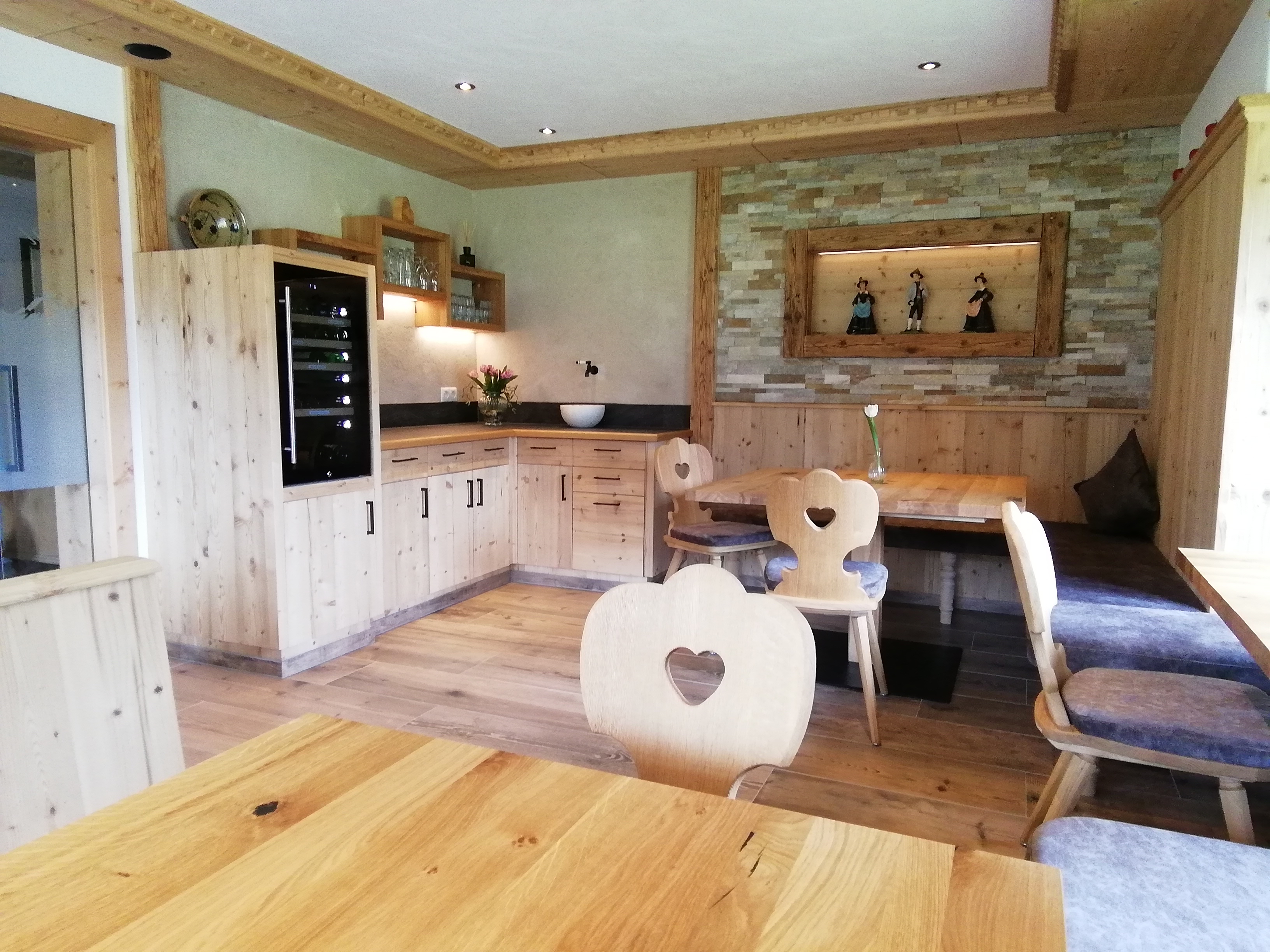 In unserem mit natürlichen Materialien und edlen Stoffen ausgestatteten Appartements und Zimmer trifft liebevoller Charme auf Wohnkomfort und sorgt für Wohlgefühl auf ganzer Linie. Um den Ländliche Stil zu behalten wurde viel mit dem Naturholz(Fichte, Zirbe oder Altholz) gearbeitet. In den zwei Dachgeschoss Appartements ist das komplette Dach auf Sicht. Die Appartements sind mit Kachelöfen ausgestattet und sorgen für behagliche Wärme.
